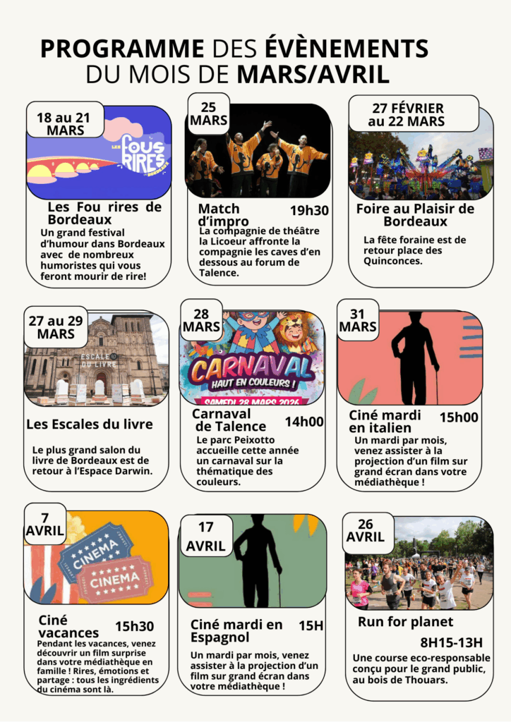 Votre programme culturel à vivre en mars-avril, préparé par notre journaliste en herbe Célestin DARRIET COMETS!